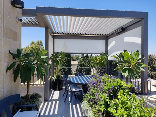 - העדף צבעים ניטרליים בפרגולה – פרגולות אלומיניום בצבעים כמו אפור, שמנת או פחם משתלבות טוב כמעט עם כל גוון.