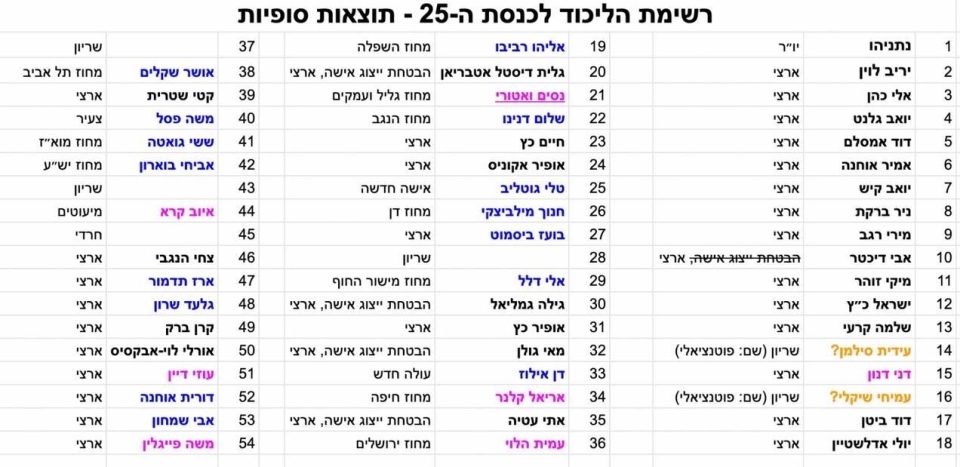 רשימת הליכוד לפי תוצאות ראשוניות, לא כוללת השריונים במקומות 14 - 16 - 28 - 37