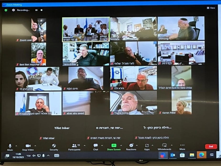 שר הפנים משה ארבל כינס יחד עם מנכ"ל משרדו רונן פרץ וגורמי המקצוע במשרד ישיבת הערכת מצב מיוחדת עם ראשי הרשויות המפונות בדרום ובצפון, יו״ר השלטון המקומי חיים ביבס, ראשי הרשויות בדרום ובצפון, יו״ר מרכז המועצות האזוריות שי חג׳ג׳, נציגי המועצות האזורית, נציגי האוצר, ומנהל אגף חרום במשרד אלי רגב