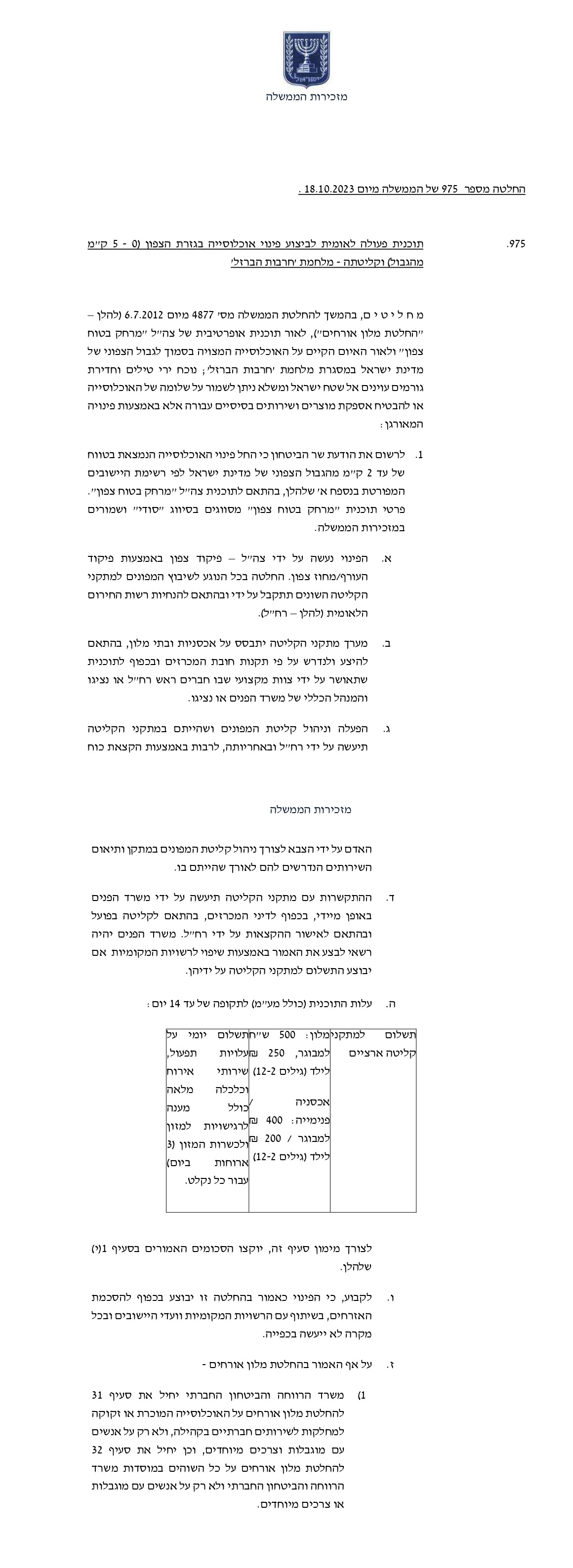 מלחמת חרבות הברזל בהמשך להחלטת הממשלה מס' 4877 מיום 6.7.2012 ("החלטת מלון אורחים"), לאור תוכנית אופרטיבית של צה"ל "מרחק בטוח צפון" ולאור האיום הקיים על האוכלוסייה המצויה בסמוך לגבול הצפוני של מדינת ישראל.