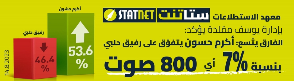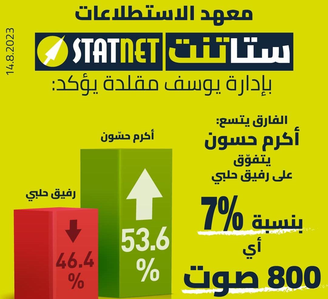 לפי ממצאי הסקר בניפוי מתלבטים פרופורציונאלי, אכרם חסון היה מקבל 53.6 אחוז ורפיק חלבי 46.4 אחוז, אשר מהווים פער של 800 קולות בשקלול אחוז ההצבעה, שעומד על 88.5% .