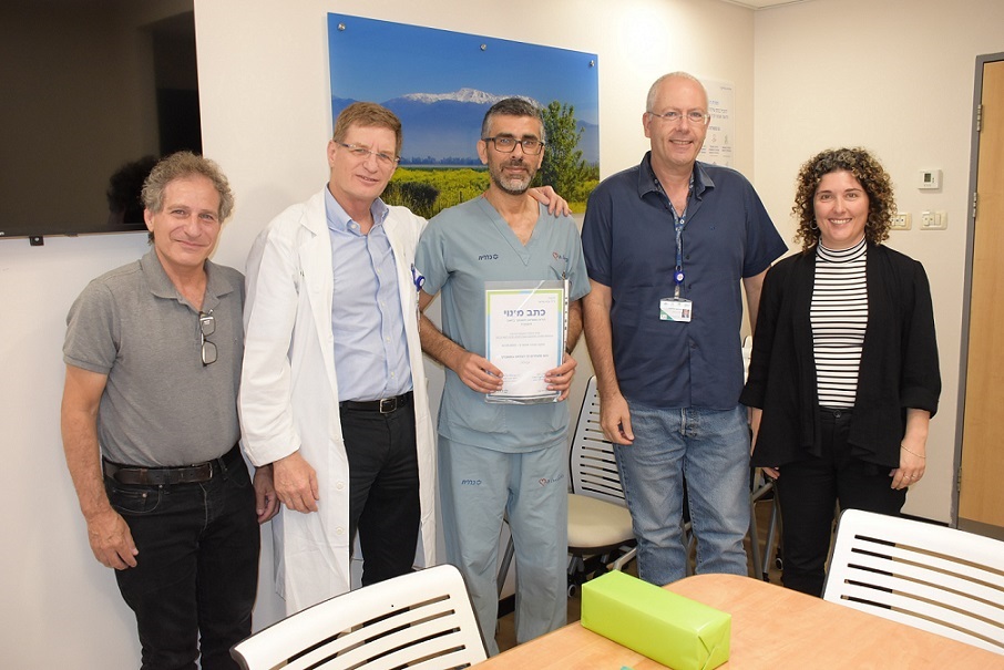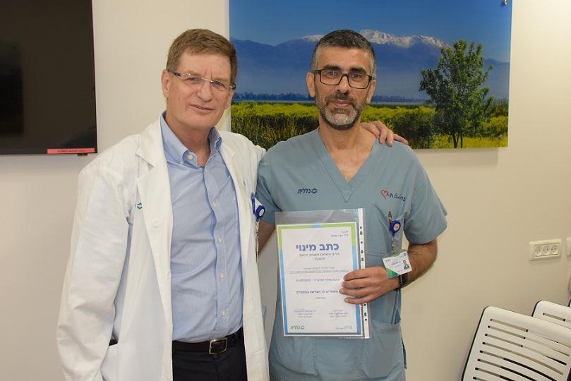 בטכס מרגש בהנהלת ביה"ח העניקו את כתב המינוי החדש לד"ר עדוי, מנהל ביה"ח ד"ר אבי גולדברג ומנהל המערך הקרדיולוגי של כרמל פרופ' אבינעם שירן.