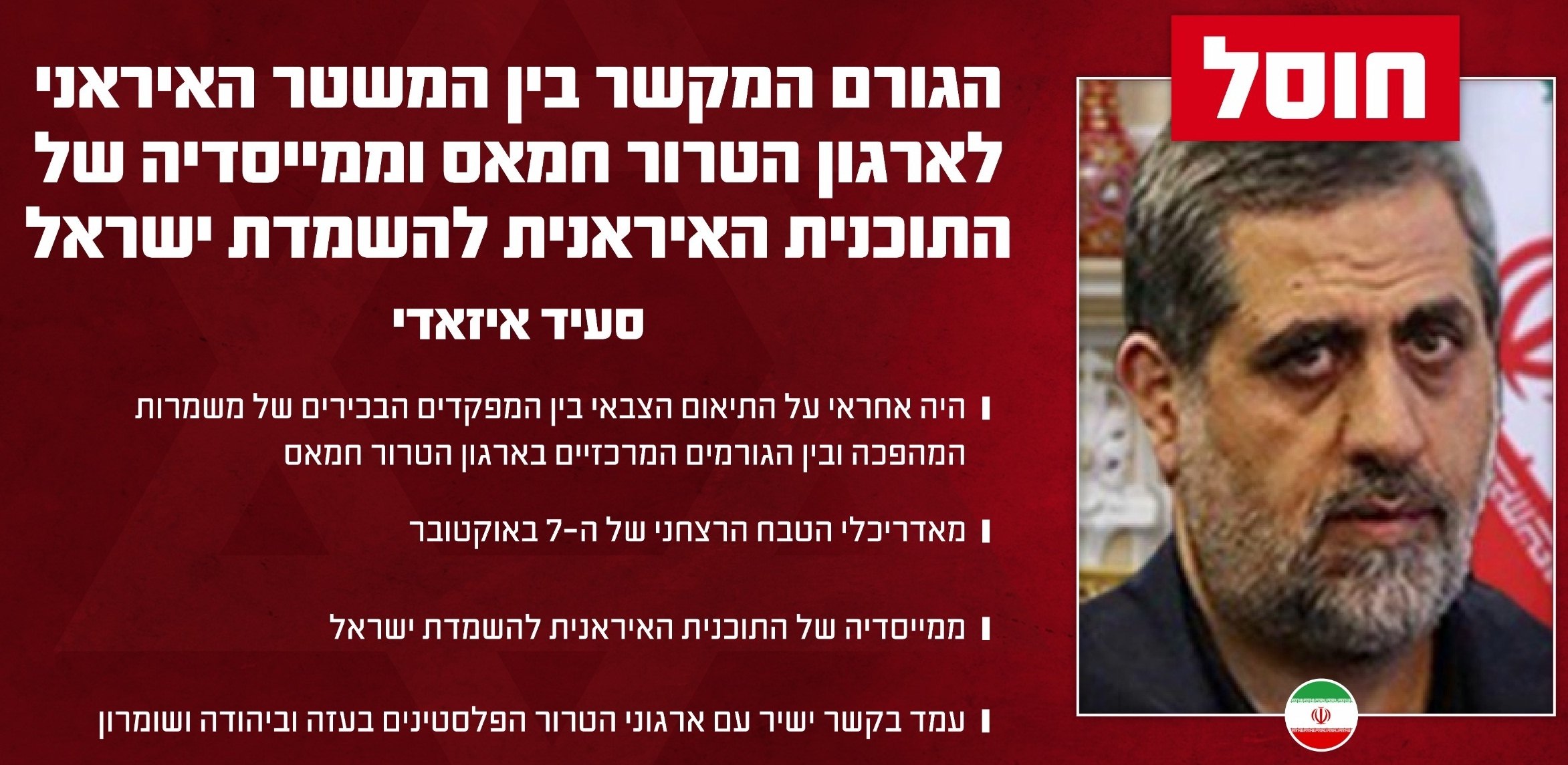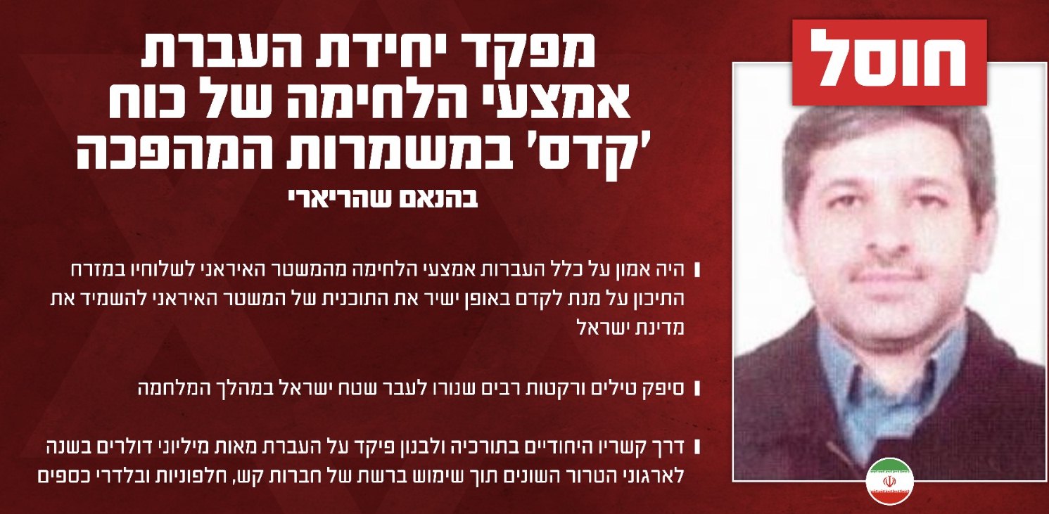 צה״ל חיסל את סעיד איזאדי, מפקד גיס פלסטין בכוח ׳קדס׳, הגורם המקשר בין המשטר האיראני לארגון הטרור חמאס וממייסדיה של התוכנית האיראנית להשמדת ישראל, בנוסף בהנאם שהריארי חוסל ברכבו, יותר מ-1,000 ק״מ ממדינת ישראל בזמן שנסע במערב איראן.