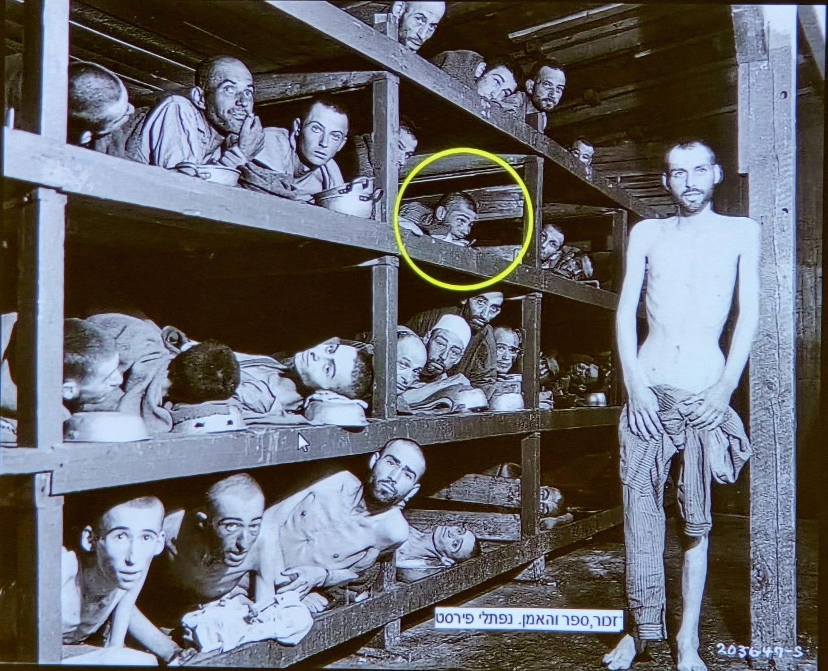 נפתלי פירסט שוכב על הדרגש השלישי, בצריף 56, בצילום שבוצע 4 ימים אחרי השחרור של מחנה בוכנוולד על ידי החיילים האמריקאים.