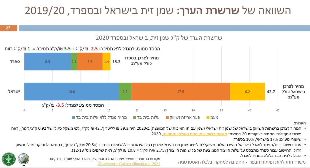 ממצא נוסף הוא שגם בספרד, גידול הזיתים לשמן הזית אינו רווחי ללא התמיכה הישירה שניתנת לחקלאים באירופה. בשקלול כל שיטות הגידול, העלות הממוצעת לייצור ק"ג שמן זית בספרד גבוהה ב-2.5 ₪ מהמחיר הממוצע שניתן למגדל על ק"ג שמן זית. אמנם, תמיכות האיחוד האירופי, העומדות בממוצע על 3.5 ₪ על כל ק"ג שמן, מביאות את המגדל הממוצע לרווח של 1 ₪ על כל ק"ג שמן. לעומת זאת, בהיעדר תמיכה ישירה למגדל בישראל, המגדל מפסיד 3.5 ₪ לק"ג שמן. עוד נמצא כי הפער ברמה הצרכנית מצוי גם בהבדל בפערי השיווק בין ישראל לספרד: הפער בין המחיר למגדל לבין מחיר השוק בישראל הוא 17.5 ₪ לק"ג שמן בממוצע, בעוד שבספרד פער השיווק עומד על 4.5 ₪ לק"ג. בספרד המחיר לצרכן כולל מע"מ עומד על כ-15.3 ש"ח לק"ג שמן זית, ומגדלי הזיתים מפסידים כ-2.5 ש"ח כשהם לא מקבלים תמיכה ומרוויחים כ-1 ש"ח על כל ק"ג שמגדלים כשהם מקבלים תמיכה מהמדינה. בישראל, המחיר לצרכן כולל מע"מ עומד על כ-42.7 ש"ח לק"ג ומגדלי הזיתים מפסידים כאמור כ-3.5 ש"ח לק"ג.