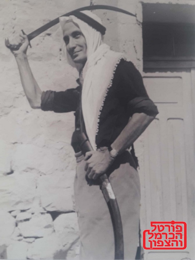 תמונת ארכיון משנת 1955,שנמצאת באוסף של שיח' חסין אבו רוכן, בתמונה שחקן שלקח חלק בסרט "גבעה 24 אינה עונה" שצולם בכפר עוספיה, ותאר את מלחמת השחרור.