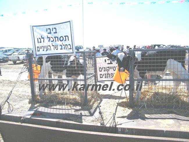 לשר התמ"ת שלום שמחון שהגיע לחנוך את אזור התעשייה מבוא כרמל חיכו הרפתנים שמחו כנגד הרפורמה בענף החלב ודרשו צדק חברתי.