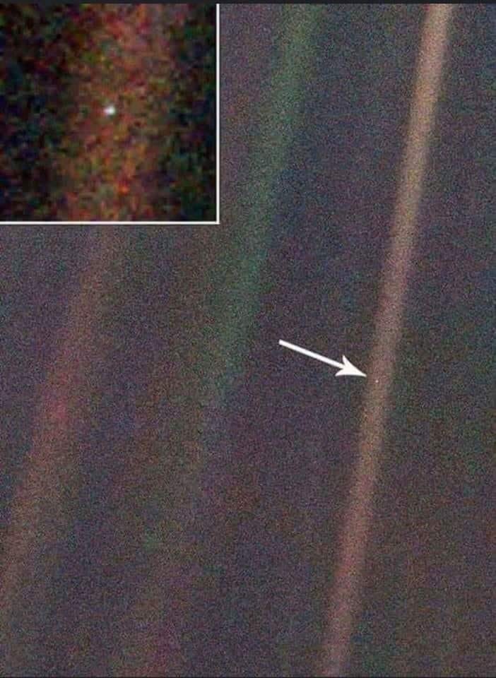 "הצלחנו לצלם תמונה זו, ואם תביטו בה, תראו נקודה. הנקודה הזו. זה הבית. זה אנחנו. עליה, כל אחד עליו אי פעם שמעתם, כל אדם שאי פעם חי, חיו כאן את חייהם... כדור הארץ הוא במה קטנה בתוך הזירה הקוסמית רחבת הידיים. חשבו על נהרות הדם שנשפכו בידי כל אותם מצביאים וקיסרים בכדי שיוכלו, עטורי תהילה וניצחון, להפוך לאדוני הרגע של חלקיק הנקודה... התרברבויותינו, החשיבה העצמית המדומיינת שלנו, אשלייתנו כי אנו בעלי מקום מיוחס ביקום, כולן מאותגרות בידי נקודת האור החיוורת הזו."