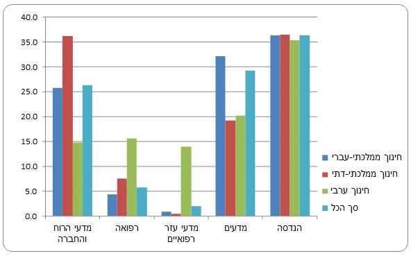 שיעור הלומדים מדעים בקרב גברים מצטיינים בוגרי החינוך הממלכתי-עברי 32.1% גבוה מבוגרי החינוך הממלכתי דתי 19.2% וערבי 20.1%. המצטיינים בוגרי החינוך הערבי נוטים יותר ללמוד רפואה מאשר מצטייני החינוך העברי, ומצטייני החינוך הממלכתי-דתי נוטים יותר ללמוד מדעי הרוח והחברה.
