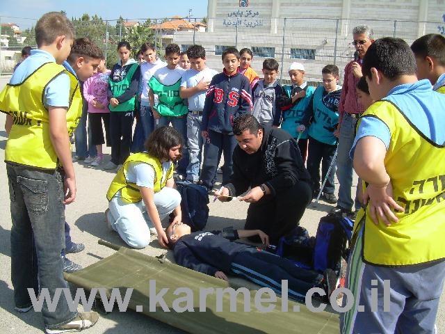 תרגול צוות עזרה ראשונה בית ספרי בפינוי תלמידים "נפגעים מדומים" אל נקודת ריכוז הפצועים ופינוי ע"י מד"א.