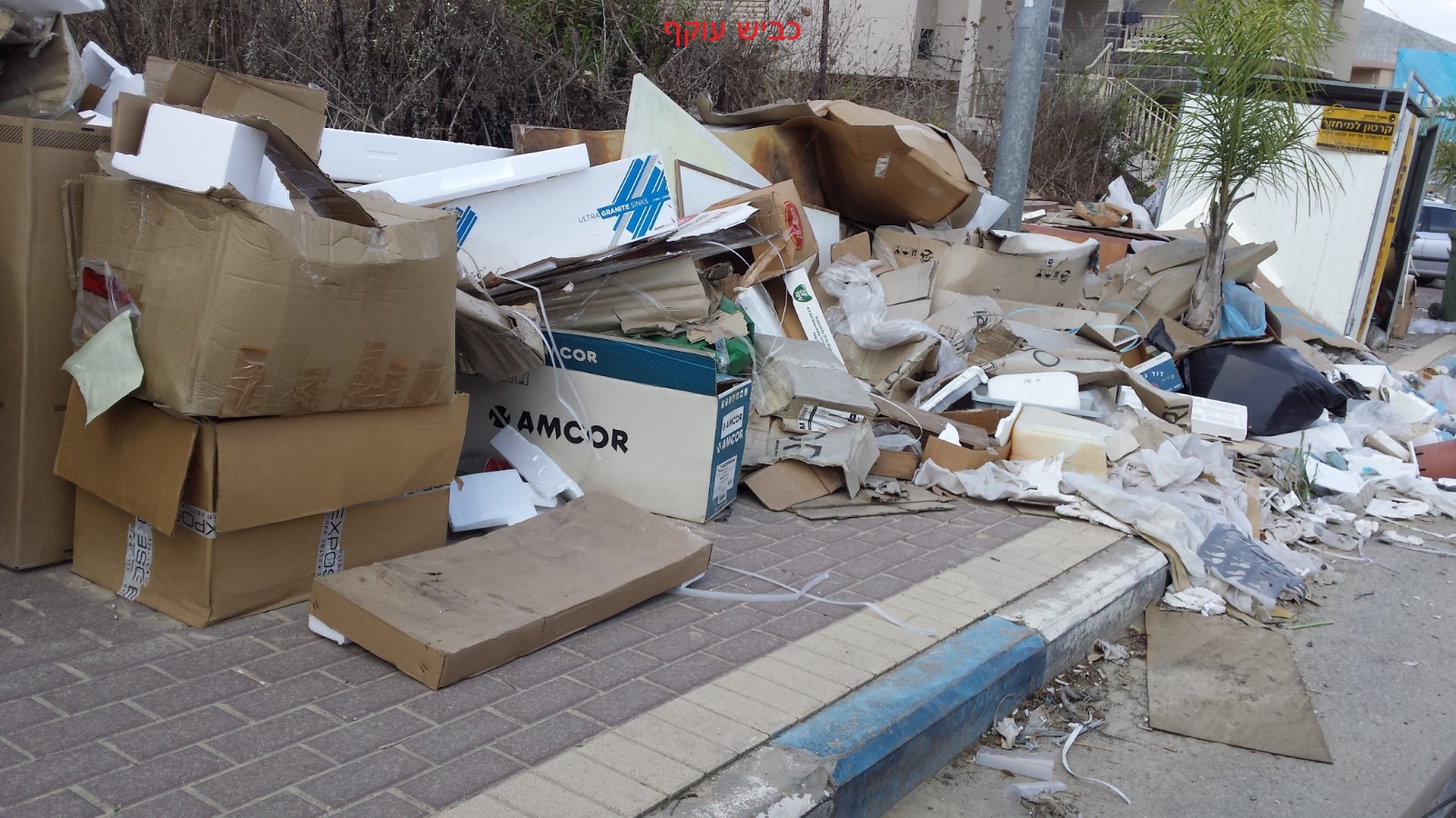 8. כביש העוקף, קרטונים מושלכים על המדרכה ומפריעים להולכי הרגל.