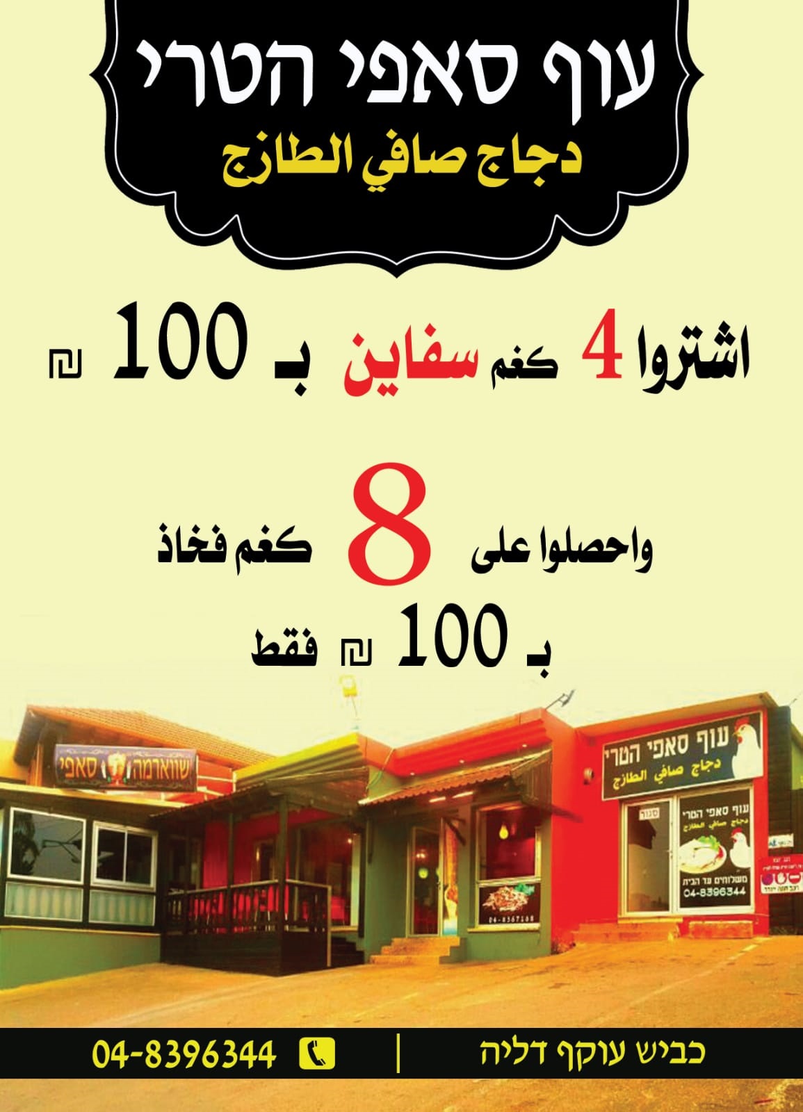 מבצע סוף השבוע בעוף סאפי הטרי, קונים 4 ק"ג חזה עוף ב 100 ש"ח, ומקבלים 8 ק"ג כרעיים במחיר 100 ש"ח בלבד, עוף סאפי הטרי ממשיך לשמור על איכות ניקיון ומוצרים טריים, ומחירים שאין להם מתחרים, ברוכים הבאים.
