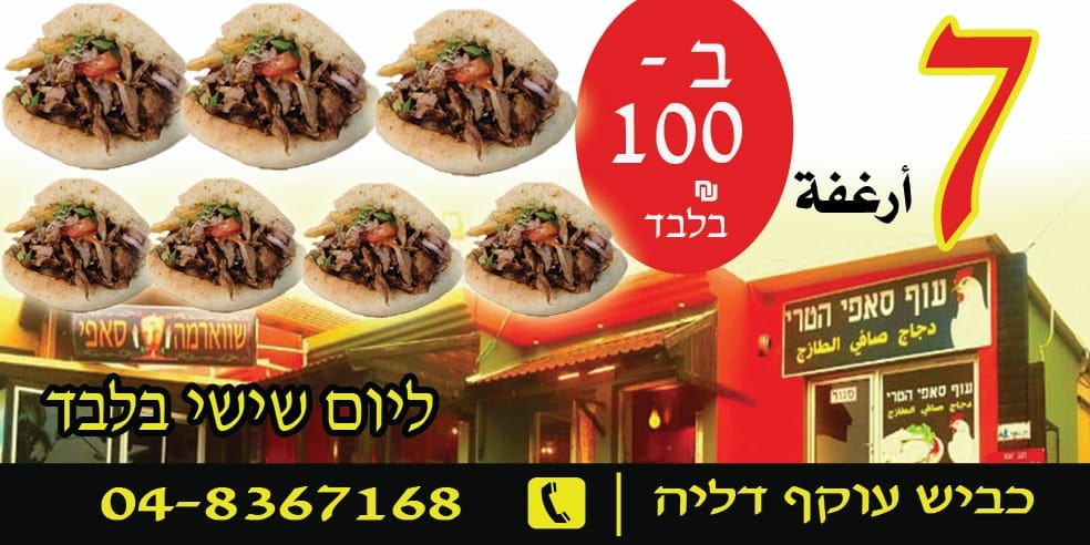מבצע בלתי נתפס, בשווארמה סאפי, בעוקף דאלית אל כרמל, ציבור הלקוחות מוזמן להגיע וליהנות מהמבצע של יום שישי, קנו 7 פיתות שווארמה רק ב 100 ש"ח.