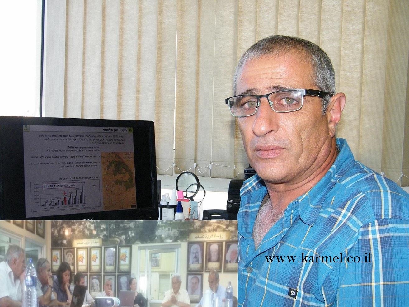 האני עמאשה חבר ועדת היגוי למרחב ביוספרי כרמל במצגת לשני הכפרים עוספיה ודליה, מסביר משמעות השטח הביוספרי והתועלות, הכפרים יושבים היום רק על 16.152 דונם מתוך 100אלף לפני קום המדינה.