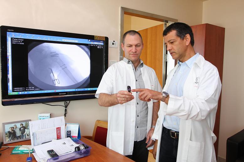 בתמונה: ד"ר דורון נורמן, מנהל המחלקה ומומחה לטראומה אורטופדית (מימין) וד"ר ניר הוס, רופא בכיר במחלקת אורתופדיה ב' ברמב"ם, עם הפלטות. צילום: .