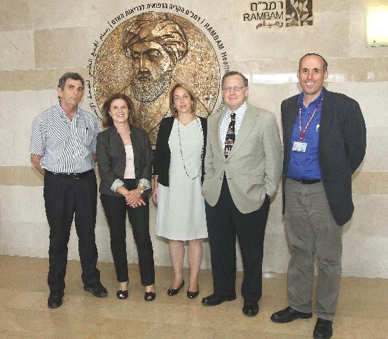 בתמונה מימין לשמאל: ד"ר מרק ארקוביץ, ד"ר מיכאל לה קוואליה, פרופ' מרים בן-הרוש, מנהלת המחלקה ההמטו-אונקולוגית לילדים ברמב"ם, ד"ר שפרה אש, ד"ר איתן גרוס מהדסה. צילום: פיוטר פליטר.