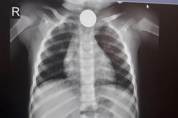 לחדר מיון ילדים של המרכז הרפואי הלל יפה הגיע ילד כבן ארבע מפרדס חנה-כרכור, לאחר שבלע חתיכת פלסטיק ממשחק בו שיחק. החלק היה בצורת עיגול המחובר לחוט תיל באורך של כחמישה סנטימטרים. בצילום נראה הגוף הזר בתוך חלל הקיבה. מהירות תגובת חברי הצוות הביאה לכך שהגוף הזר נשלף בזמן קצר של כשעה מזמן הגעתו של הילד לחדר המיון.